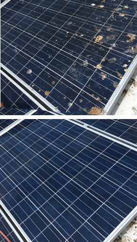 Removal of the following list of contaminants will significantly impact on the efficiency of your solar panels ability to perform at its maximum power production. Dirt and dust build up, bird and bat faeces, saps and pollen, moss, mould and mildew, salt water crystallisation (which is prevalent in coastal areas), mains water mineral deposits as a result of hosing your panels, industrial and commercial residues, carbon and soot from vehicles and heavy transport exhaust.